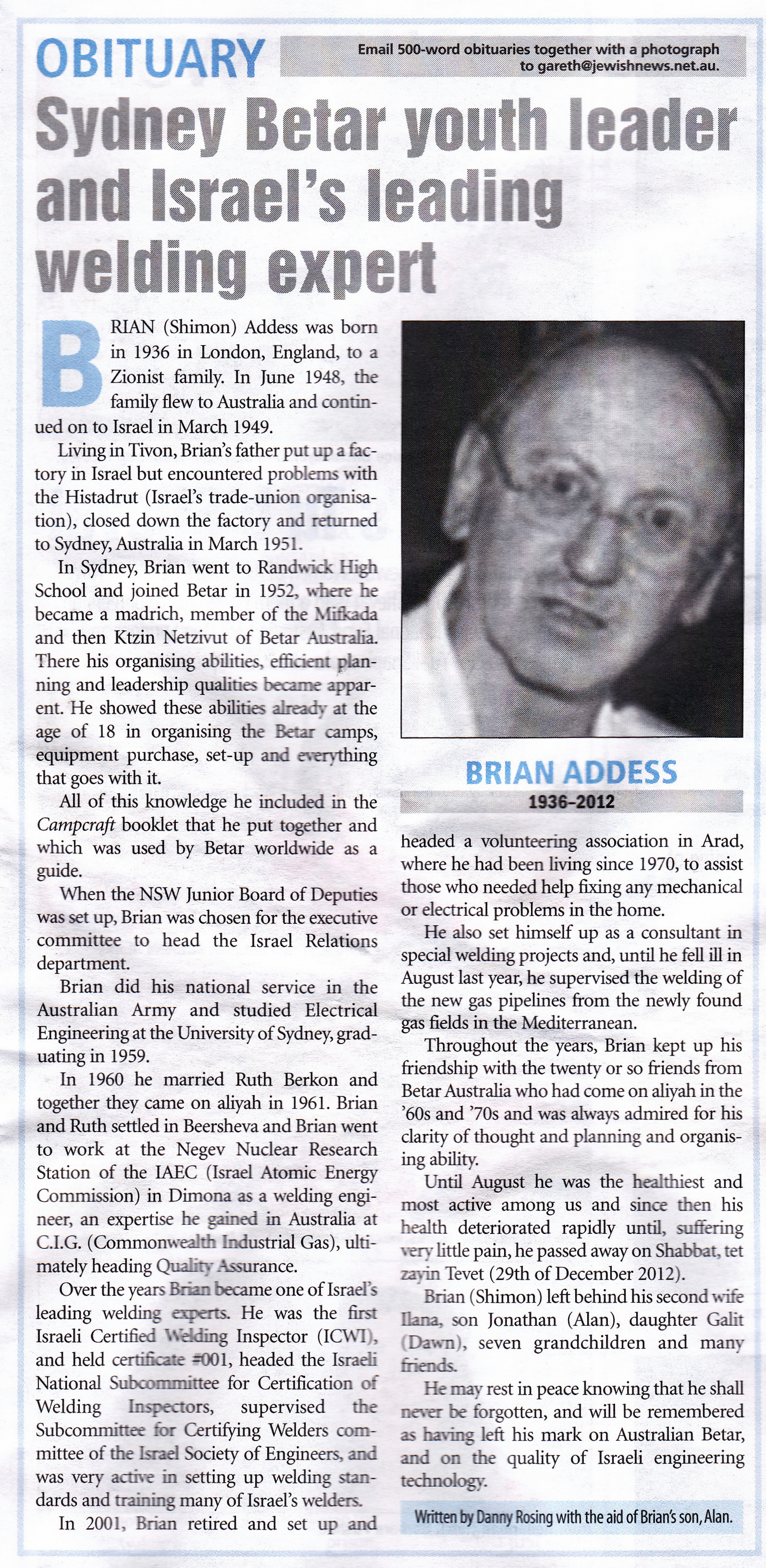 Throughout the years Brian kept up his friendship with the twenty or so friends from Betar Australia who had come on Aliya in the '60s and '70s and was always admired for his clarity of thought and planning and organising ability. Until August he was the healthiest and most active among us and since then his health deteriorated rapidly until, suffering very little pain, he passed away on Shabat, tet zayin Tevet (29th of December 2012). Brian (Shimon) left behind his (second) wife Ilana, son Jonathan (Alan), daughter Galit (Dawn), 7 grandchildren and many friends. He may rest in peace knowing that he shall never be forgotten and will be remembered as having left his mark on Australian Betar and on the quality of Israeli engineering technology.