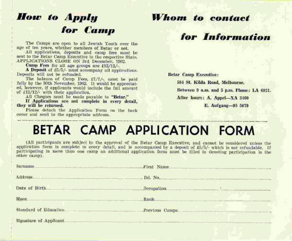 1. Sam Offman was the Mefaked, the camp fees were 12 guineas, and that the application would be returned if it was not complete in every detail. Note also that our phone numbers were still in the two-letter four-number phase. Please do not try and call Avraham or Eric at their old numbers - they have since moved.